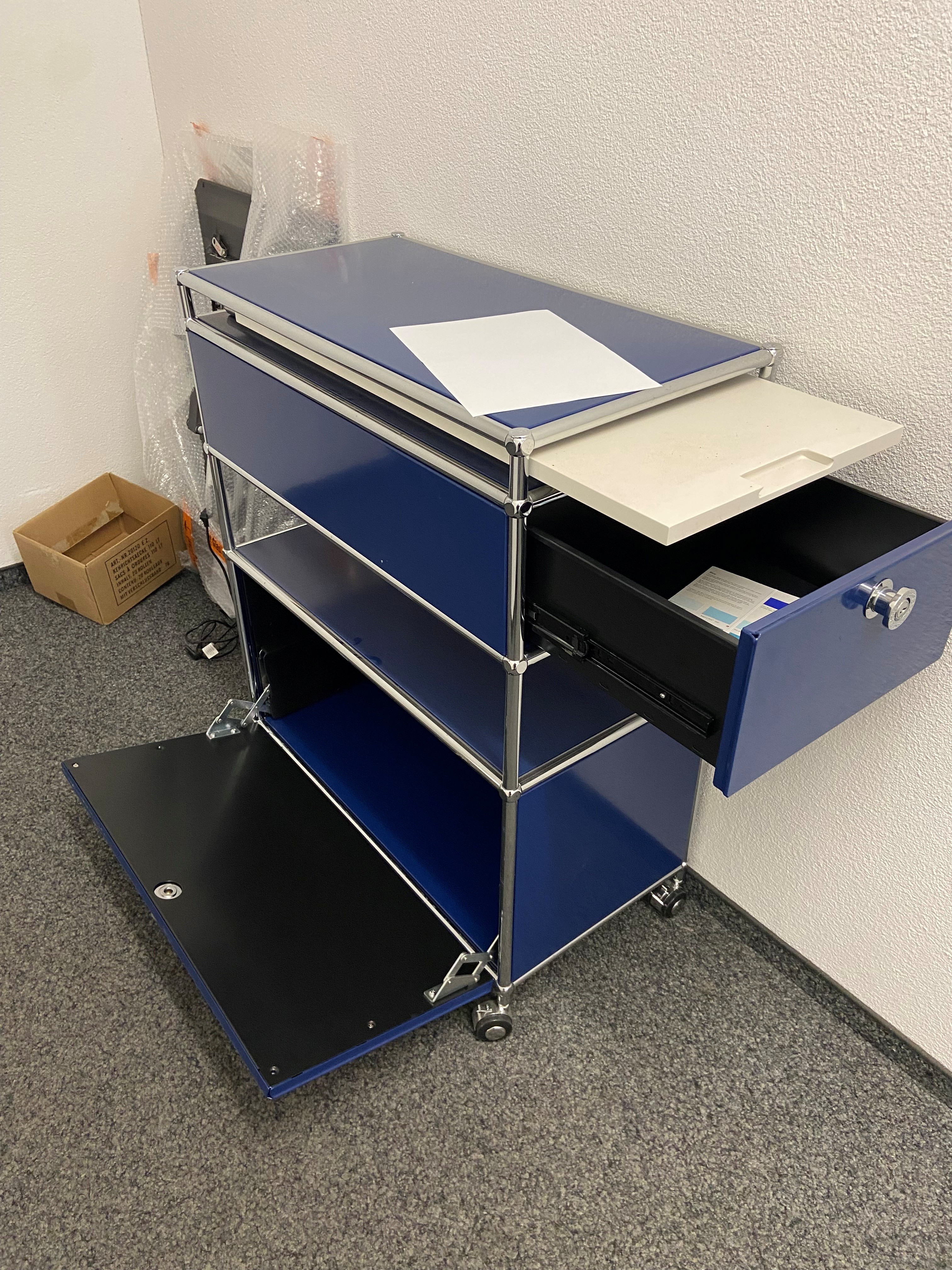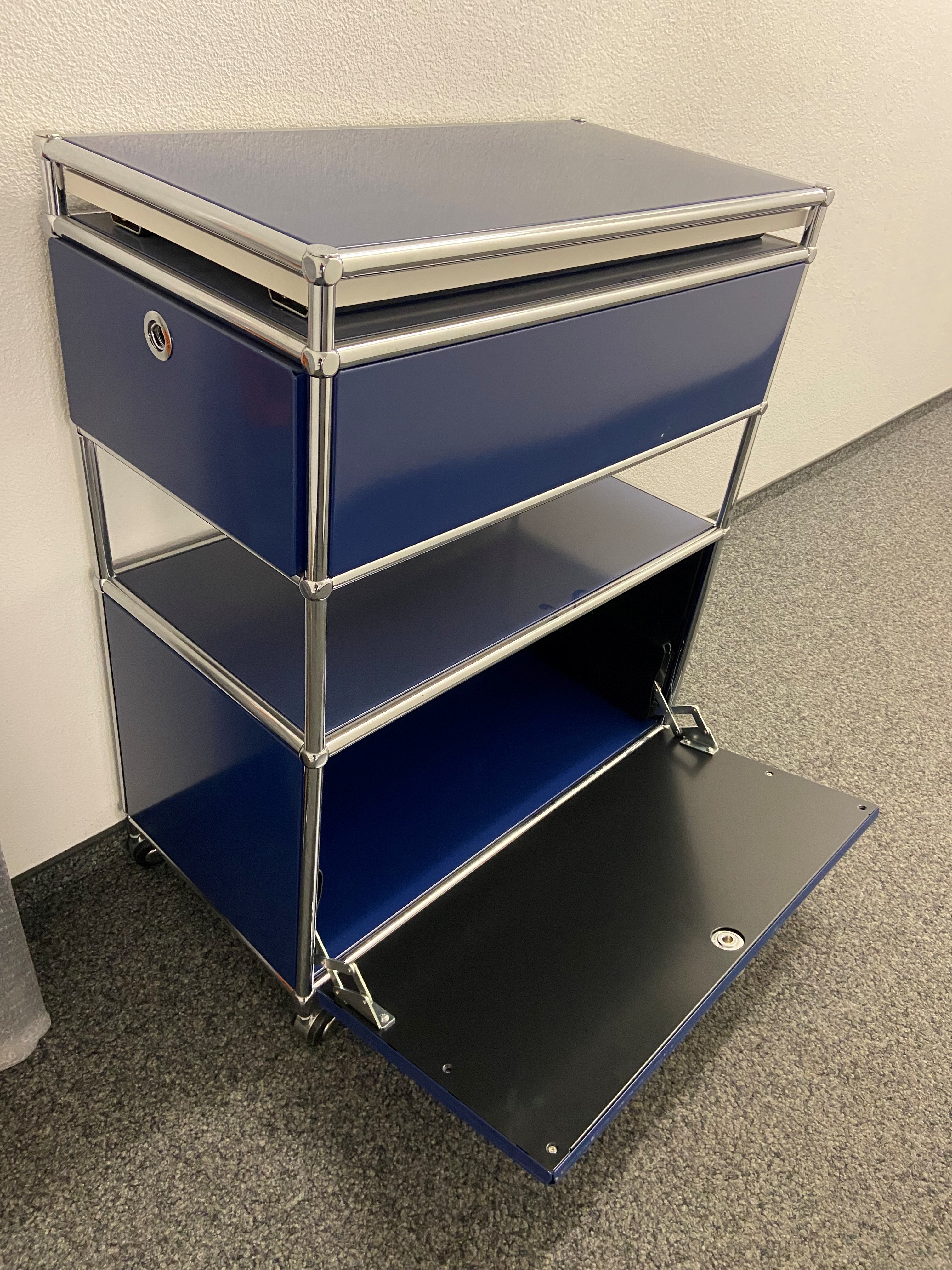 Modular furniture SaleServierwagen mit ausziehbarem Tablett, 2 seitliche Schubladen, Fach mit Klappe. Sonderanfertigung in RAL 5013 Kobaltblau. Gestell Edelstahl verchromt, Metallpaneele in RAL 3013. Ausstellungsstück . 50% Rabatt. Fertig montiert. Abholbereit in unserem Showroom in Hünenberg ZG.
