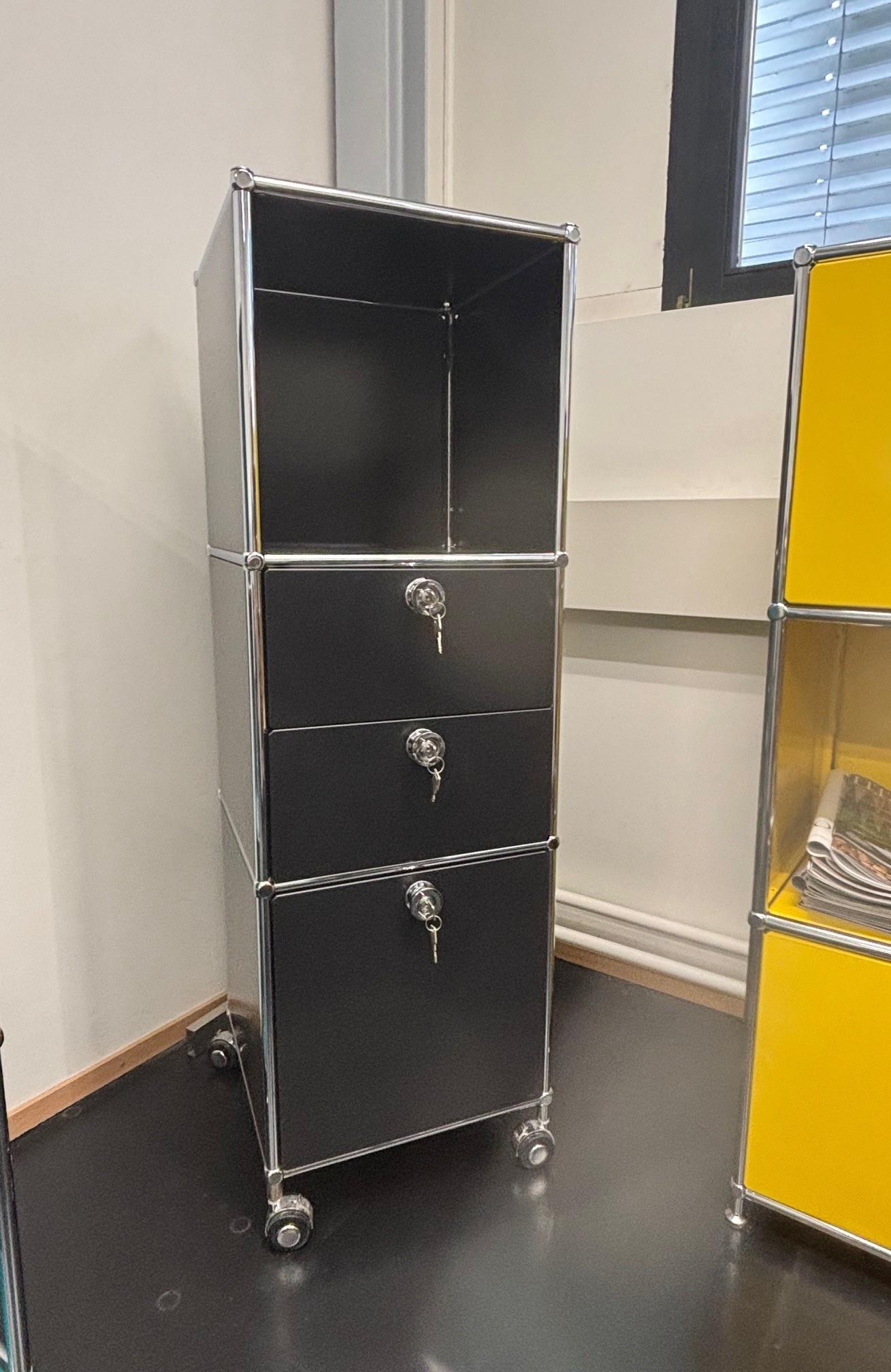Schubladenelement auf Rollen. Doppelschublade und Schublade. Griff / Griff mit Schloss. Gestell Edelstahl verchromt, Paneele in schwarz.  45% Rabatt. Fertig montiert. Abholbereit in unserem Showroom in Hünenberg ZG.
