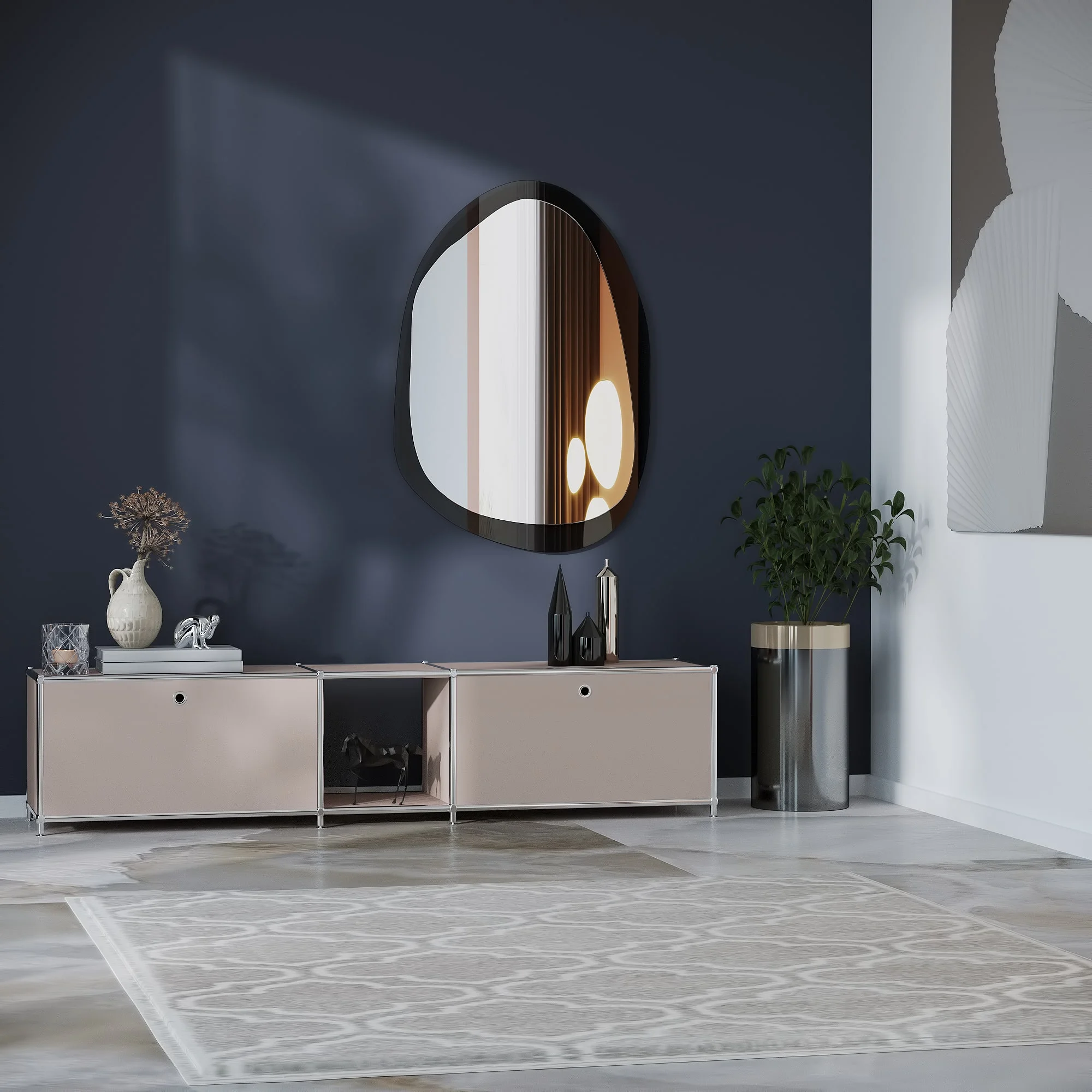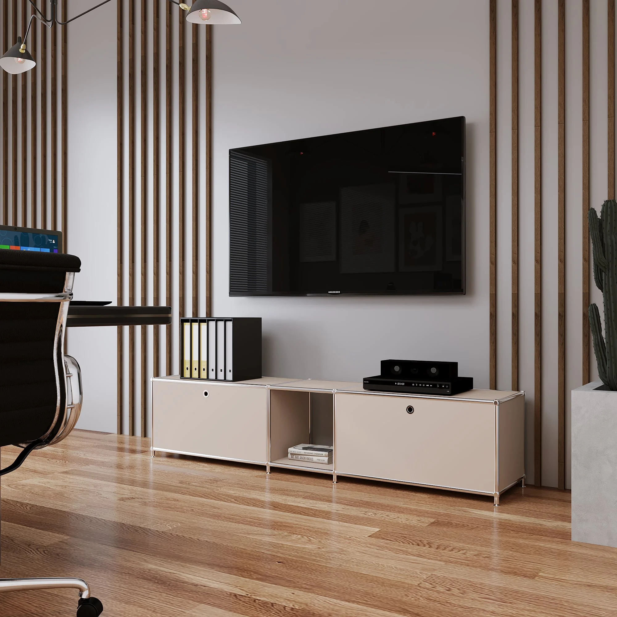 Dieses lange Lowboard mit zusätzlichem offenem Fach bietet eine großzügige Aufbewahrungslösung für Wohn- und Arbeitsbereiche. Durch seine geradlinige Gestaltung fügt es sich harmonisch in verschiedene Einrichtungsstile ein und schafft zugleich eine luftige Atmosphäre im Raum.